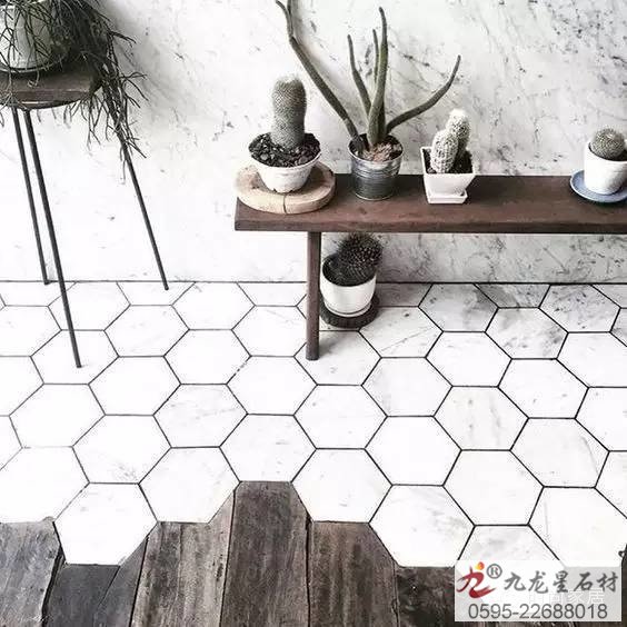 ↑六角形大理石紋地磚和木地板拼接,讓地面更有趣,做的時候要多留心工藝哦。