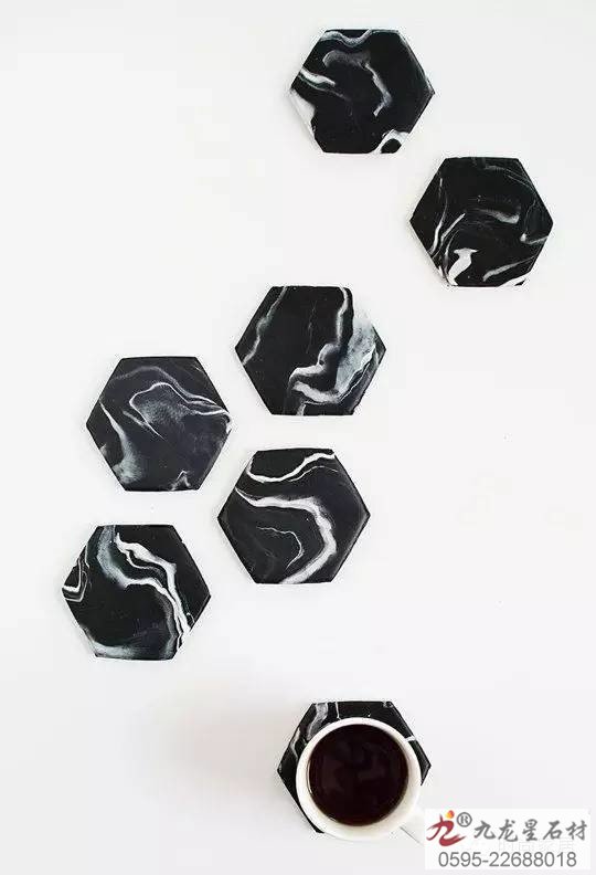 ↑六角形黑色大理石花紋的杯墊深邃又有型,拼起來還可以做隔熱餐墊,實用又好看。