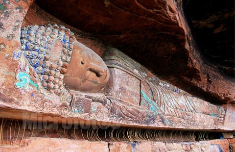 臥佛院摩崖造像位于四川省安岳縣城北面25公里的八廟鄉(xiāng)臥佛溝,以其臥佛大像和石刻佛經(jīng)聞名于世。臥佛鐫刻在距地面5米的崖壁上,全長(zhǎng)23米,頭長(zhǎng)3米,肩寬3.1米。它 背北面南,頭東足西,左側(cè)而臥。臥佛形體修長(zhǎng),身著袈裟,面部豐盈,神態(tài)安祥,雙目微閉,似睡非睡,展現(xiàn)出釋迦牟尼涅槃時(shí)那超脫一切的意境。臥佛溝南面的 石壁上,有15窟經(jīng)龕,規(guī)模大小不等??探?jīng)面積達(dá)130多平方米,經(jīng)文目錄繁多,內(nèi)容極其豐富。主要經(jīng)目有《大唐東京大敬愛寺一切經(jīng)論目序》、《佛名 經(jīng)》、《大般涅槃經(jīng)》、《般若波羅密多心經(jīng)》、《佛頂尊勝陀羅尼經(jīng)》、《妙法蓮花經(jīng)》等。這裡是我國(guó)寶貴的石刻經(jīng)庫(kù)。 (資料來(lái)源:石工坊雕刻)