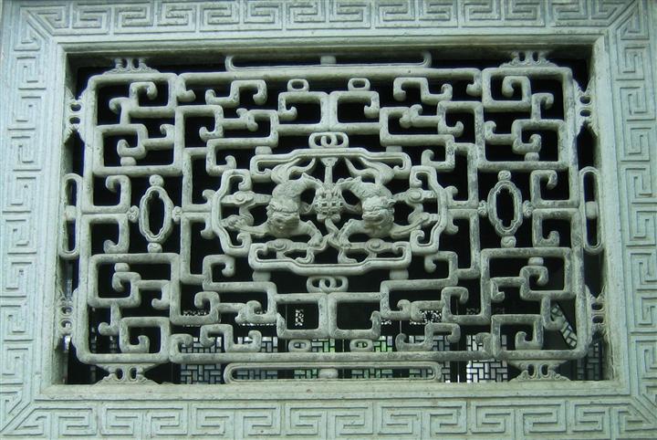 石窗以長(zhǎng)方形為最多,還有方形、圓形、拱形等。長(zhǎng)方形的石窗一般以直式為多,橫式次之。石窗窗心的形態(tài)更是多樣,窗心有不分層的,也有分層的,分層的多分為二層或三層。分為二層的,多有主次之分,或上大下小,或上小下大,大的部分作主題紋飾,小的部分作輔助紋飾。分為三層的多以中心一層最大,上下兩層大小對(duì)稱。不分層的或作一整體雕刻,或在中心作一主題雕刻,四周圍繞各種裝飾。中心雕刻的形狀有非常多的變化,或方或圓,或扇形,或瓶形,或多角形,不一而足。中心雕刻使石窗主題更加突出,在裝飾上又增添了變化,在視覺(jué)上更加豐富。