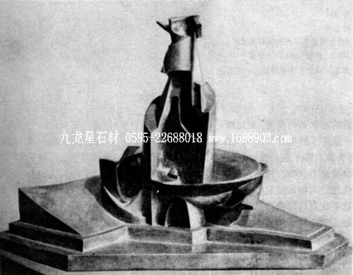波菊尼在《未來(lái)主義雕塑技巧的宣言》中主張“絕對(duì)和完全廢除確定的線條和不要精密刻劃的雕塑。我們要把人物打開(kāi), 把它納入境之中……透明的玻璃、鐵塊、金屬絲、室內(nèi)和室外的燈光能夠表示平面、方向以及一種新的現(xiàn)實(shí)的調(diào)子和中間調(diào)子”。(6)未來(lái)主義者就是希望達(dá)到讓作品與環(huán)境、形體與空間互相貫穿。波菊尼在他的《空間中一個(gè)瓶子的發(fā)展》這件靜物雕塑上, 傳統(tǒng)的雕塑空間被擴(kuò)大。瓶子被解體后又重新構(gòu)成, 但作品此時(shí)已經(jīng)和介于它與環(huán)境之間的基座融為一體, 呈現(xiàn)一種向空間極度擴(kuò)張的態(tài)勢(shì)。這件僅有15英寸高的青銅作品卻能盤(pán)居著一個(gè)巨大的空間量。他還通過(guò)其它作品的實(shí)驗(yàn),驗(yàn)證了他在雕塑中所追求的永久價(jià)值——“運(yùn)動(dòng)的風(fēng)格”和“雕塑即環(huán)境”, 而這反倒是另一種對(duì)“未來(lái)”的預(yù)言:其“運(yùn)動(dòng)”真的波及到達(dá)達(dá)主義、超現(xiàn)實(shí)主義雕塑以及波普雕塑家環(huán)境流派的“環(huán)境”觀。