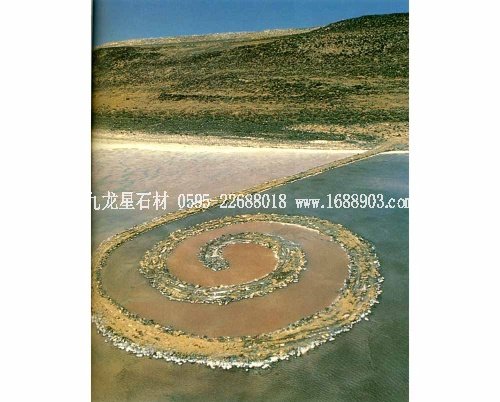 雕塑家羅伯持·史密森以最有震撼力的方式表達(dá)了他的這種天才藝術(shù)家思想,在美國(guó)猶他州偏遠(yuǎn)的大鹽湖筑造了一個(gè)名為《螺旋防波堤》的直徑為160英尺、螺旋長(zhǎng)1500英尺的巨大旋轉(zhuǎn)空間。他借助大型機(jī)械,用當(dāng)?shù)氐暮谏鋷r石、以堆積的這種松散方式塑造了他和大鹽湖的偉大傳奇。