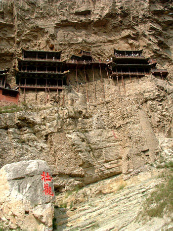 懸空寺,懸掛在北岳恒山金龍峽西側(cè)翠屏峰的半崖峭壁間,始建于北魏太和15年(公元491年),始建初期,最高處的三教殿離地面90米,因歷年河床淤積,現(xiàn)僅剩58米。1957年列為山西省重點文物保護單位,1982年,列入全國重點文物保護單位。整個寺院,上載危崖,下臨深谷,背巖依龕,寺門向南,以西為正。全寺為木質(zhì)框架式結(jié)構(gòu),依照力學原理,半插橫梁為基,巧借巖石暗托,梁柱上下一體,廊欄左右緊聯(lián)。