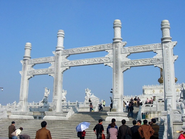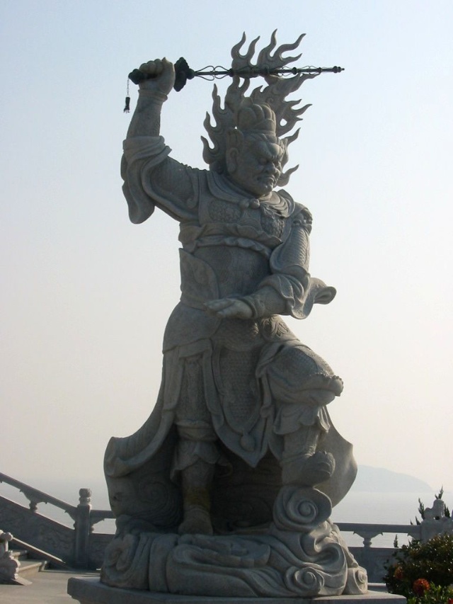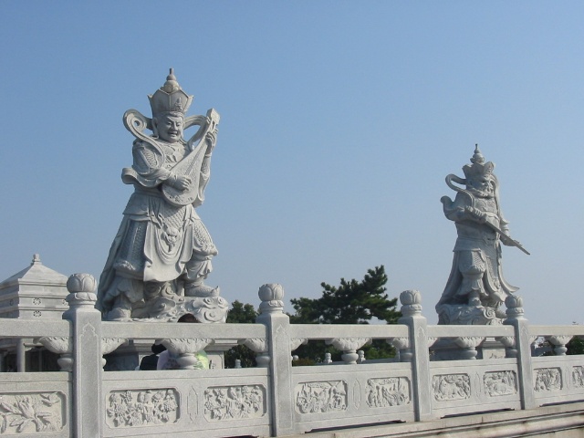 禮佛廣場上四大天王塑成了中國古代的武將形象,這是古印度佛教傳入中國后,佛教文化和中華文化相圓融的結果。 “這四大天王塑像的原形,他們的出身并不是很高貴,而是屬于那種“放下屠刀,立地成佛”的人物。四大天王原形的由來,源于古典小說“封神演義”中“魔家四將”。在周武王率兵起義,反對暴虐的無道君主——商紂王的正義戰(zhàn)爭中,這魔家四兄弟曾經(jīng)率兵于佳夢關一線阻擋周武王東進的軍隊。經(jīng)過數(shù)番爭斗,結果是被周武王的軍隊盡數(shù)殲滅,魔里海、魔里青、魔里壽、魔里紅這四兄弟也亡命于周軍之手。戰(zhàn)爭結束后,這四個助桀為虐的“魔頭”,經(jīng)姜子牙開封神榜時,就被任命為“四大天王”。
