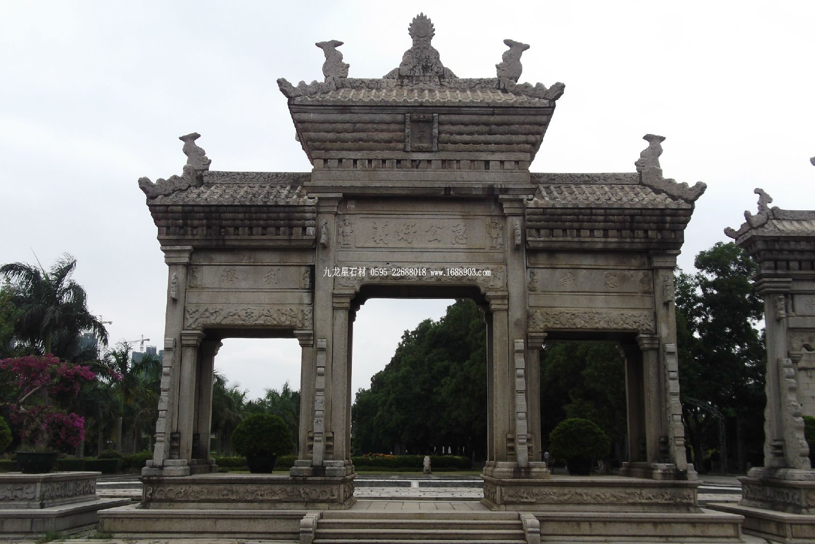 解放后因擴(kuò)建馬路需要移走,一建公司的師傅們連夜施工,整拆整蓋,原樣又建在了城南的陶然亭公園,多好的東西啊!‘文革’中楞把它說成是“四舊”,下場(chǎng)是被砸爛、棄之。 寺院石雕山門 北京齊化門(今朝陽門)外神路街口的琉璃牌樓是北京同類牌樓中最大的,那是老東岳廟的遺物,現(xiàn)在掛上了“文物保護(hù)’的牌子。整個(gè)北京城保存下來最大的石牌樓得數(shù)明十三陵的牌樓,是六柱五間十一樓,建于嘉靖十九年,至今有小五百年的光景啦。這牌樓高十四米多,長有二十九米,梁朽、斗拱、屋頂都是仿木制結(jié)構(gòu)的形制雕刻成的。梁朽上雕刻出旋子點(diǎn)金彩畫,從殘存的顏色還能隱約看出當(dāng)年石坊上曾經(jīng)有過美麗的彩繪。在石坊六根方柱石下是巨大的夾柱石(又叫袍柱石座),石上雕刻著巨龍、海獸、獅子、麒麟和云氣波濤,鬼斧神工的匠術(shù)令人贊嘆不已。 今天,古老的北京在保護(hù)和修葺古老牌樓的同時(shí),一些新的牌樓也拔地而起:王府飯店前面的牌樓,琉璃廠文化街的牌樓,紫玉飯店的牌樓,地壇公園西門外的牌樓,還有老北京微縮景園的牌樓……得,聊這么會(huì)子啦,今兒個(gè)就先到這兒,您抽功夫迢彎,看看這些個(gè)牌樓那不也是件有意思的事嗎?興許到時(shí)咱們還能碰上,到那時(shí)我沏上壺好茶再跟您慢慢聊吧!.