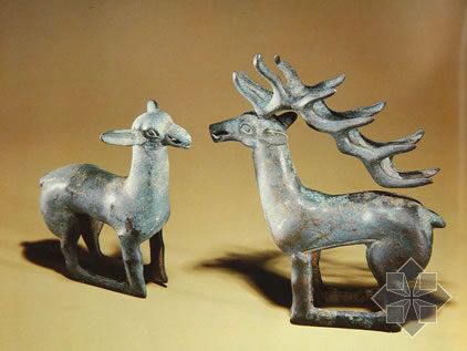 春秋以后的青銅器以人形為支架的逐漸多了起來,重要的代表作品有湖北隨縣曾侯乙墓所出的一組鐘架銅人,還出土蟠龍建鼓座。在河南洛陽金村的東周墓葬中出土有銅、銀、玉等不同材質(zhì)的人物形象。還有江蘇漣水三里墩所出的銅臥鹿。這些都是戰(zhàn)國時期的作品。