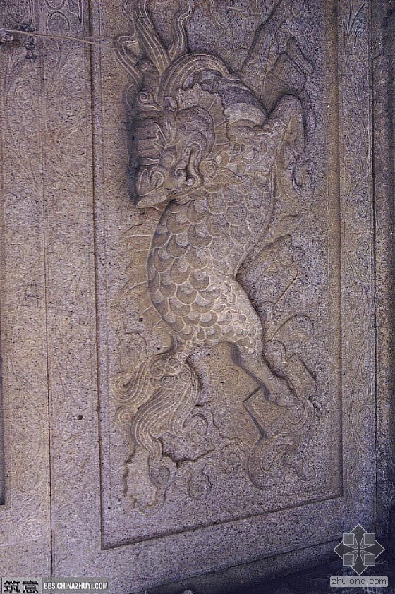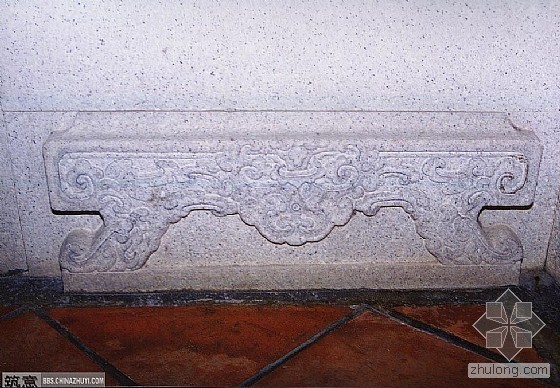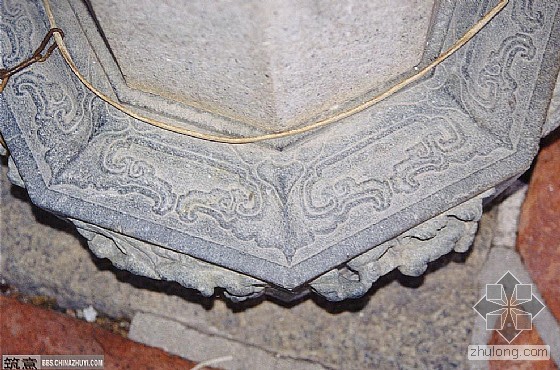 | 圖中左右兩個壁柱下石作下段也一樣,稍小。和須彌座的圭角一致的是都立于土襯石上。按照劉大可《中國古建筑瓦石營法》標(biāo)準(zhǔn)的須彌座的圭角用如意云。倒是圖中形狀有象龜腳之處;整體應(yīng)該是仿幾案。臺灣研究閩南古建的學(xué)者稱之為“柜臺腳”。