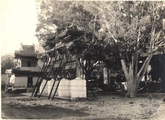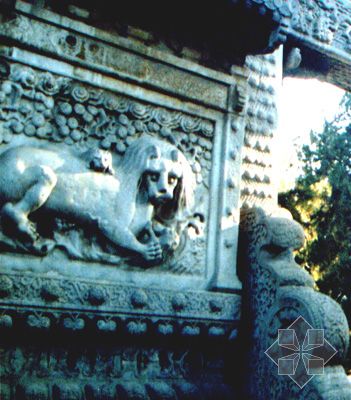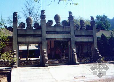 乾隆十三年(1748年)進行了大規(guī)模的修建,并仿五塔寺而建石雕金剛寶座塔。同時新建木、石、磚三聯(lián)牌樓。其中石牌樓最為精致,雕刻極細,是典型的清代風格。北京的磚牌樓只有碧云寺這一例.碧云寺磚牌樓,從其形制看,其仍屬于琉璃牌樓一類.碧云寺石坊為四柱三間沖天柱式,兩側共有四座石雕影壁屏風,它該算是北京影壁最多的牌樓.