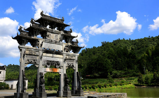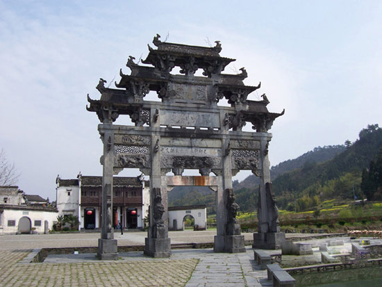 胡文光牌坊:俗稱西遞牌樓。建于明萬(wàn)歷六年(公元1578年),距今已有400多年的歷史。牌坊高12.3米,寬9.95米,系三間四柱五樓單體仿木石雕牌坊,通體采用當(dāng)?shù)氐摹镑鹂h青”大理石雕筑而成,整個(gè)牌坊上下用典型的具有徽派特色的浮雕、透雕、圓雕等工藝裝飾出各種圖來(lái),而每一處圖案都蘊(yùn)含有極深刻的寓意。胡文光牌坊造型莊重、典雅,石刻技藝出眾,堪稱明代徽派石坊的代表作。