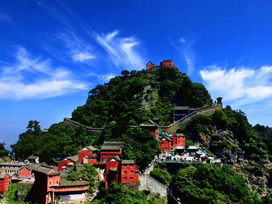 武當(dāng)山又名“太和山”,位于中國(guó)中部湖北省丹江口市的西南部。相傳為道教玄武大帝(北方神)修仙得道飛升之勝地, 歷代道教名流曾在此修煉。據(jù)記載, 唐太宗貞觀年間即在靈應(yīng)峰創(chuàng)建五龍祠。宋、元以來(lái), 代有開(kāi)拓?cái)U(kuò)建。明成祖于永樂(lè)十年(1412)曾動(dòng)用軍夫30多萬(wàn)人在此大興土木?,F(xiàn)存的36處宮觀大多是明代所建, 是中國(guó)現(xiàn)存最完整、規(guī)模最大、等級(jí)最高的道教古建筑群。宮觀內(nèi)保存的各類神像、法器、經(jīng)籍等都有較高的文物和藝術(shù)價(jià)值。明代(公元1368~1644年)時(shí),武當(dāng)山被皇帝敕封為“大岳”、“玄岳”,地位在“五岳”諸山之上。武當(dāng)主峰天柱峰,海拔1612米,周圍又有“七十二峰”、“三十六巖”、“二十四澗”等勝景環(huán)繞,風(fēng)光旖旎,氣勢(shì)宏偉,被世人贊為“萬(wàn)山來(lái)朝”。
