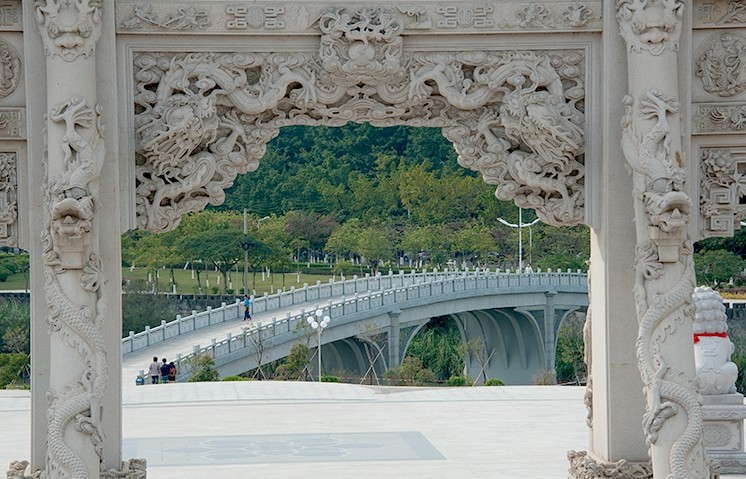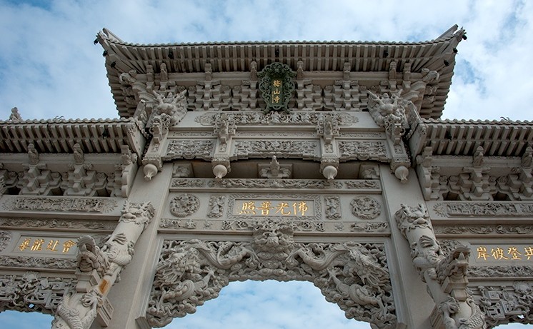 百余名惠安石雕師傅歷時兩年雕刻完工。梅山寺石質(zhì)山門總高度23米,寬23.6米,全部由花崗巖石雕刻而成,四柱三門結(jié)構(gòu),大型山門總石方用量達680多立方米,居我國現(xiàn)有石質(zhì)山門中石方用量之首。山門雕刻工藝高超,其復(fù)雜程度和難度全國罕見。斗拱采用的是整塊石材,