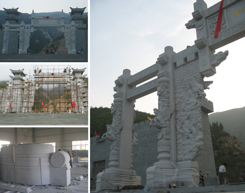 黃羊山大牌坊位于河北省涿鹿縣黃羊山國家公園,黃羊山大牌坊以中國傳統(tǒng)元素、龍及中華吉祥圖騰作為元素設(shè)計加工制作而成,整座牌坊高15米,寬25.4米,采用芝麻灰花崗巖整石制作,牌坊連接拼裝為傳統(tǒng)石卯榫結(jié)構(gòu),最大單塊重量60噸左右,加工,運輸,安裝難度極大,云峰公司克服了設(shè)計,制作,運輸,安裝等種種困難因素制作而成,使其成為石牌坊中的經(jīng)典工程。