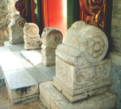 抱鼓石一般可分為兩種:一種是以徽派祠堂宅門抱鼓石為代表的樣式,稱為"螺蚌抱鼓石",多為三段:下部為基座,中部為承托件,上部為抱鼓石。整個(gè)造型不對(duì)稱,抱鼓石有向外突兀的起勢(shì),很像一只螺或蝸牛,抱鼓石就像是其所背負(fù)的厚重外殼。 另一種是以北京四合院宅門(正門或二門)為代表的樣式,稱之為"如意抱鼓石",也可分為三段:下部雕須彌座,座上蓋有方形錦巾,中間為由兩個(gè)橫放的仿錐鼓與下部的方形錦巾組合成的如意形,上部為豎立著的圓鼓,一般鼓頂部還雕有臥獅。"如意抱鼓石"較為對(duì)稱,整個(gè)造型渾然一體,也有只剩一個(gè)仿錐鼓與方巾組成半個(gè)如意形的依柱式抱鼓石. 抱鼓石的裝飾圖案 目前遺存的抱鼓石紋樣豐富多彩,從題材上來分,可分為瑞獸祥云、花鳥蟲魚和器物什錦等等,從雕刻部位可分為鼓座、鼓面、鼓頂三大類。鼓座上多浮雕著牡丹、荷花、芙蓉、葵花以及如意紋、卷草紋、祥云紋等紋樣,表達(dá)著福壽吉祥的寓意,是花好富貴的象征;鼓面上裝飾的圖形既有低浮雕紋樣,又有高浮雕的獅子。如有螺旋曲線的裝飾紋樣,還刻有三獅戲球、四獅同堂(四世同堂),五獅護(hù)欄(五世福祿)等圖案;鼓頂上面一般也雕成獅形,有站獅、蹲獅或臥獅。獅者,獸中之王也,是舊時(shí)大戶人家盡顯豪門威嚴(yán)的象征。 "門當(dāng)戶對(duì)" 抱鼓石與門簪因?yàn)樵谡T門面上下遙相呼應(yīng),在民間有所謂的"門當(dāng)戶對(duì)"之說。門簪是戶對(duì)的一種說法。 根據(jù)建筑學(xué)上的和諧美學(xué)原理,大門前有門當(dāng)?shù)恼罕赜袘魧?duì),所以,門當(dāng)、戶對(duì)常常被同呼并稱。又因?yàn)殚T當(dāng)、戶對(duì)上往往雕刻有適合主人身份的圖案,且門當(dāng)?shù)拇笮?、戶?duì)的多少又標(biāo)志著宅第主人家財(cái)勢(shì)的大小,所以,門當(dāng)和戶對(duì)除了有鎮(zhèn)宅裝飾的作用,還是宅第主人身份、地位、家境的重要標(biāo)志。 在今天,門當(dāng)戶對(duì)逐漸演變成社會(huì)觀念中衡量男婚女嫁條件的一個(gè)成語。