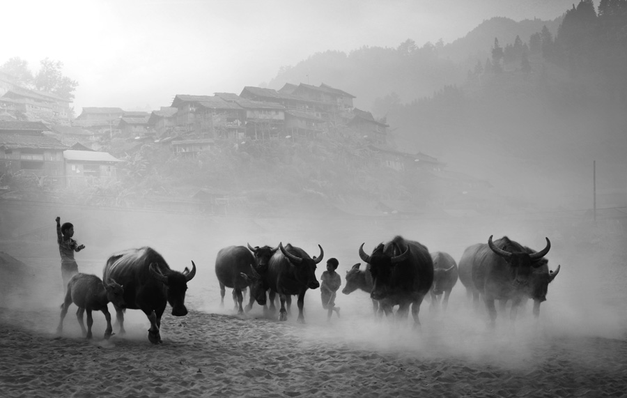 劉奕---放牧古村。作品攝于貴州黔東南卡寨,座落在一座地勢險要的半山腰上,遠遠望去,寨上一座座高聳入云的樓房鎖在煙霧中時隱時現(xiàn),充滿了神秘的色彩,兒童放牧的歡騰場景,為神秘的古寨增添了生活的氣息。
