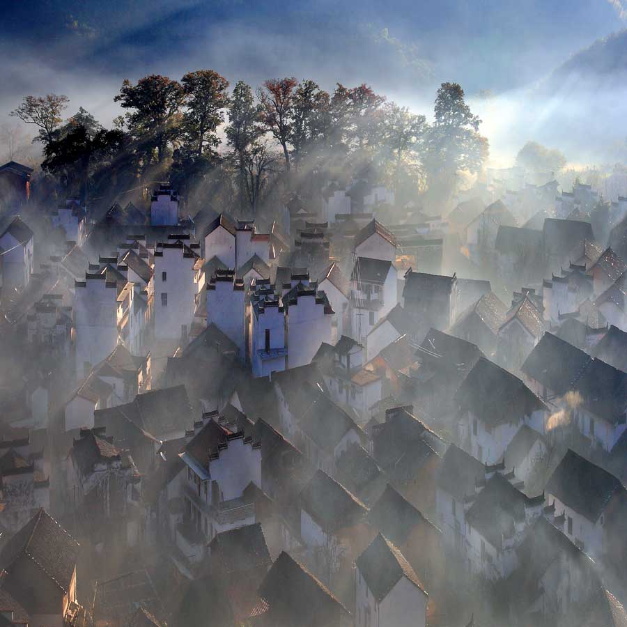 汪順陵---天上人間。作品是作者2010年在江西婺源石城拍攝的,晨霧和炊煙在山村屋頂中繚繞,初升的太陽從東方照射進來,晨霧和炊煙掩蓋了繁雜的背景,村莊仿佛在天宮一樣。