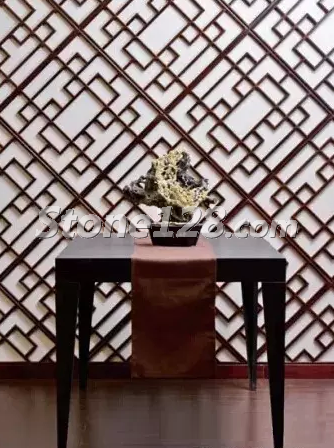 在新中式風格的大廳中,石雕作品的外形與背景窗花的菱形相互協(xié)調,取得了很好的諧調效果。石雕的色彩與整體環(huán)境的深色調相互統(tǒng)一,臘梅花典雅的黃色又活躍了色彩的意境氛圍。整體空間的直線風格與石雕作品的曲線造型相對比,剛柔相濟,收放有度,取得了很好的視覺效果。