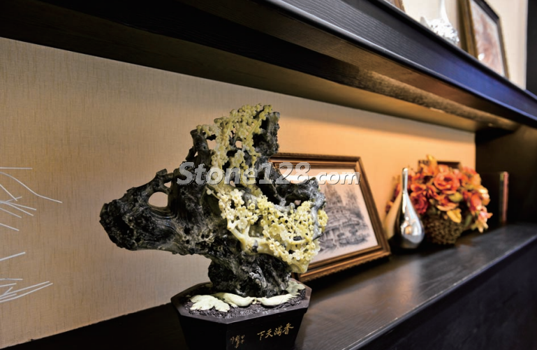 在內(nèi)室陳列柜上放置石雕作品,暖色的背景與燈光相融合,溫和的造型與豐富的陳列物品相諧調,充分體現(xiàn)了這件石雕作品中溫馨典雅的內(nèi)涵。