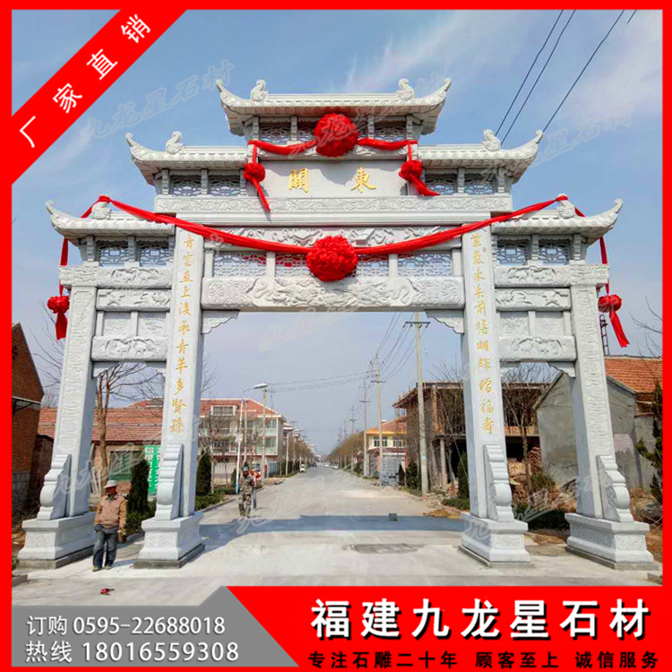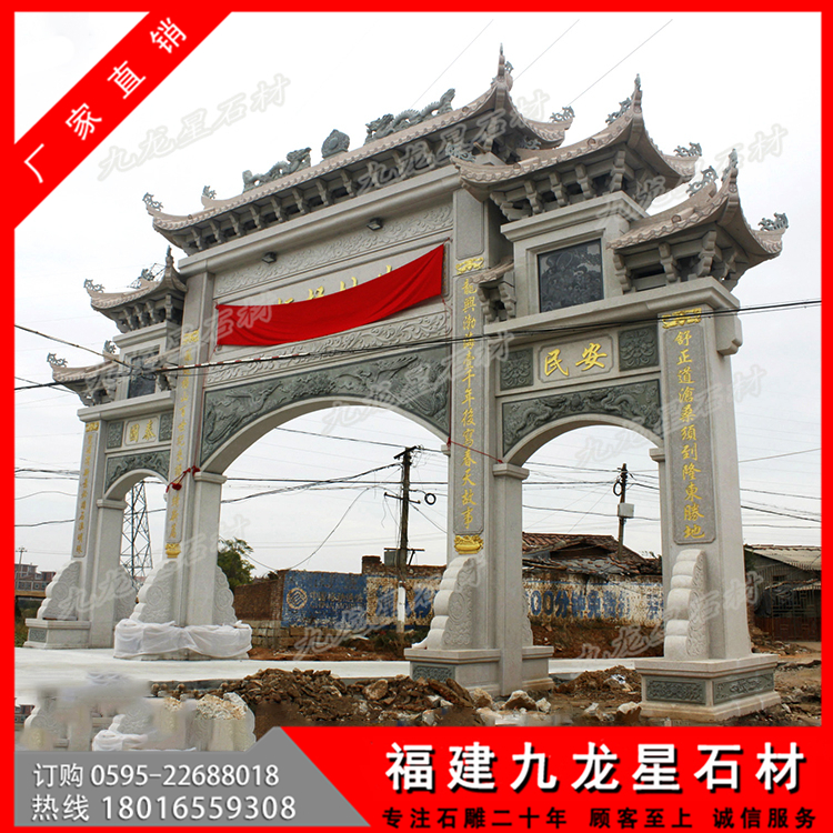 第二:牌坊大小,大型牌坊也有大小之分,筆者見過最大的牌坊高達6米,左右寬12米,深3米,整座牌坊完全采用立柱搭建,造型別致,精妙絕倫,這樣的大型牌坊價格是非常高的,當(dāng)時聽聞,需要幾千萬制作而成。但是普通的三門牌坊也可以稱之為大型牌坊,價格不過幾萬到十幾萬也非常多。主要是越大的作品,需要加工的工藝和使用的石料都會增加,并且后續(xù)的運輸,安裝也會非常的繁瑣導(dǎo)致的。