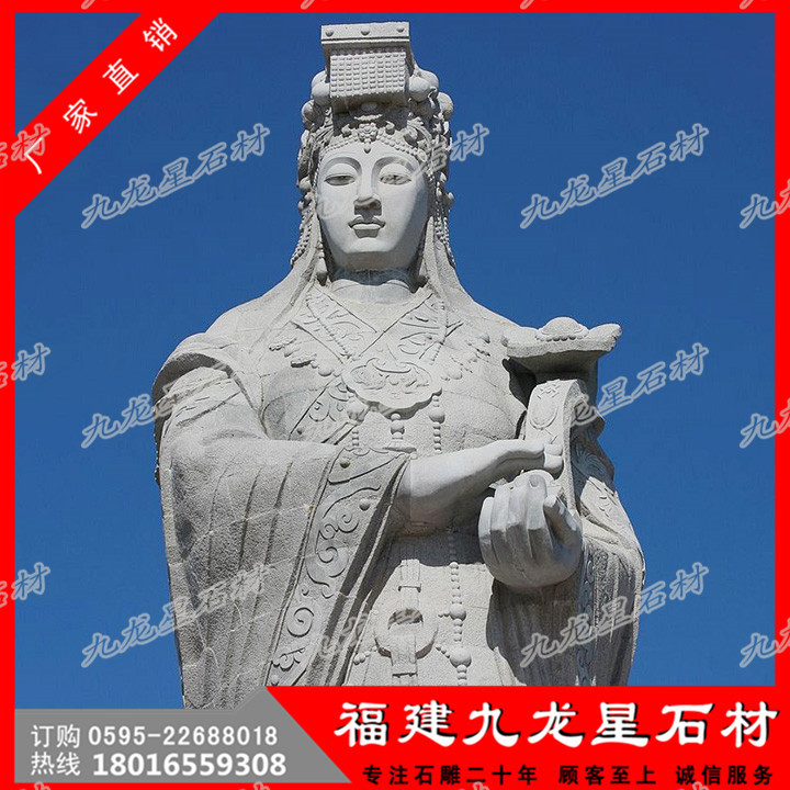 大型石雕媽祖中國民間在海上航行要先在船舶啟航前要先祭媽祖,祈求保佑順風和安全,在船舶上立媽祖神位供奉。這就是“有海水處有華人,華人到處有媽祖”的真實寫照。而影響所及,媽祖由航海關系而演變?yōu)椤昂I瘛?、“護航女神”等,因此形成了海洋文化史中最重要的中國民間信仰崇拜神之一。